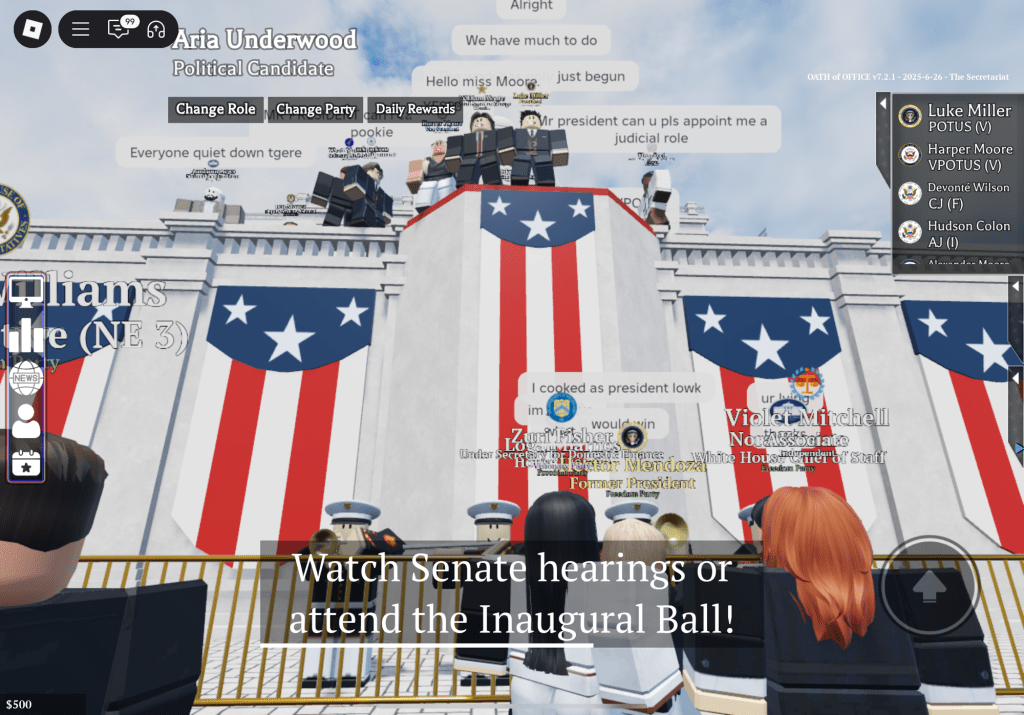 I joined the server in the middle of a MASSIVE election, with piping hot tea spilling from both parties. President Hector Mendoza of the Freedom Party was competing against candidates Luke Miller and Harper Moore of the Visionary Party. Moore and Miller, incumbents from a previous presidential administration, doubled down on Mendoza’s inaction on several key issues, from immigration to the economy. Their campaign slogan was “Unlike Mendoza, we’ve done this before.” I thought it was weirdly ironic, because Mendoza was literally finishing up his own term in office, but it was really catchy, which made their eventual win that night a surprise to no one. Their landslide victory was met with jumps and cheers from tens of viewers for the new administration.