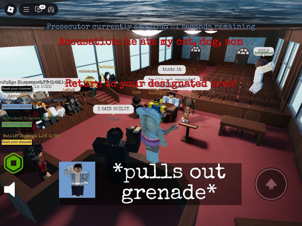 The next game I played was called “Courtroom Shenanigans” by creator rayraydog. The game worked by appointing various players as the judge, bailiff, prosecution, defense, and jury of different cases in each round. Each case was centered around an accusation, which ranged from stealing flowers to being sent into Squid Game. The judge presided over the case, sitting in a high chair at the front of the courtroom. The prosecution and defense consisted of players advocating for themselves in their cases, and they made some pretty convincing arguments. After an accusation landed that a player ate someone’s family, they even whipped out a grenade to prove their innocence.